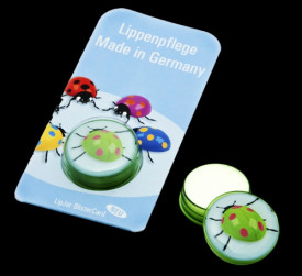 Lippenpflege-Döschen mit einem 4-farbigen Doming veredelt und attraktiv unter einer Blisterhaube verpackt.